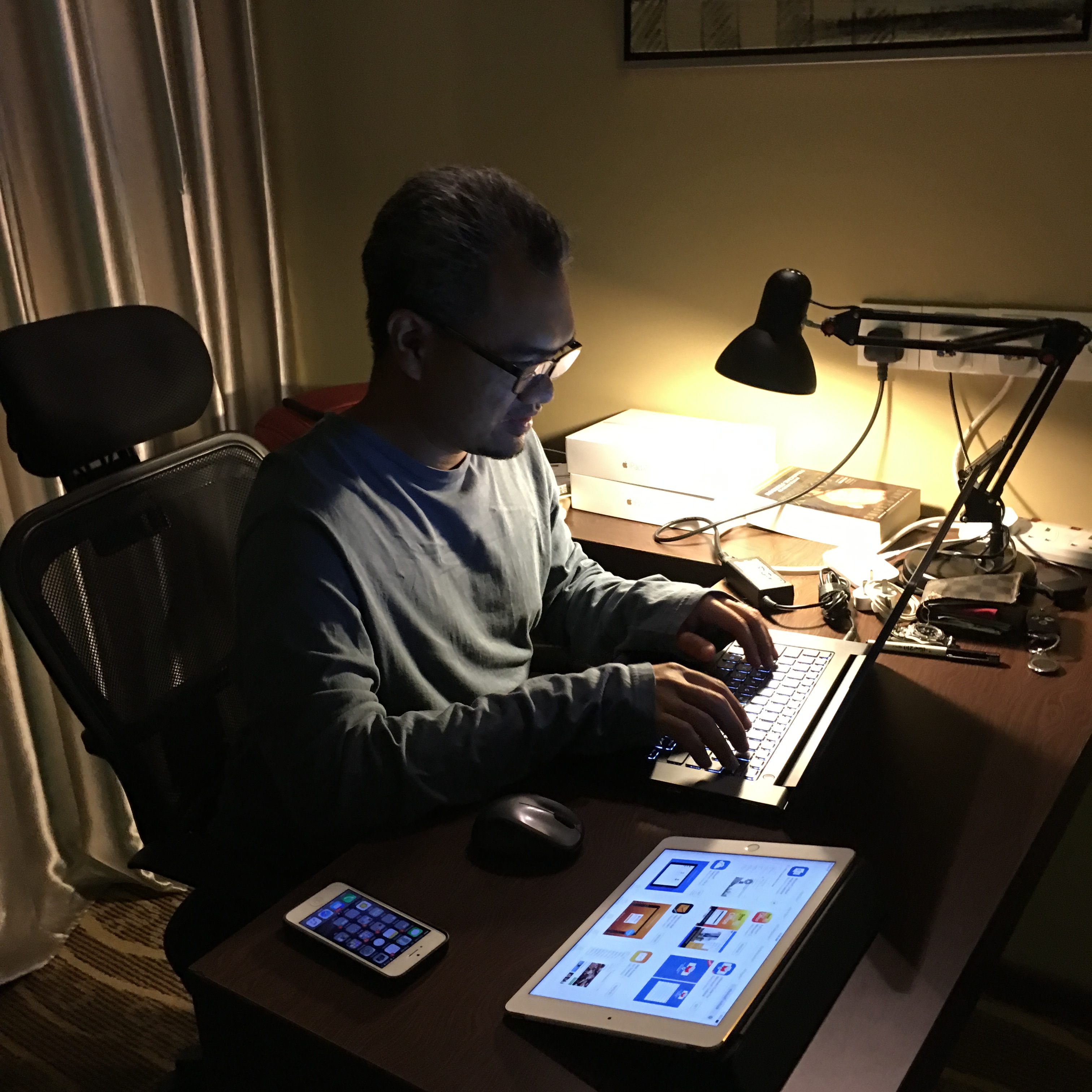 It was 4am and he was still working. Only managed to keep him company for additional 10 minutes before I finally dozed off.